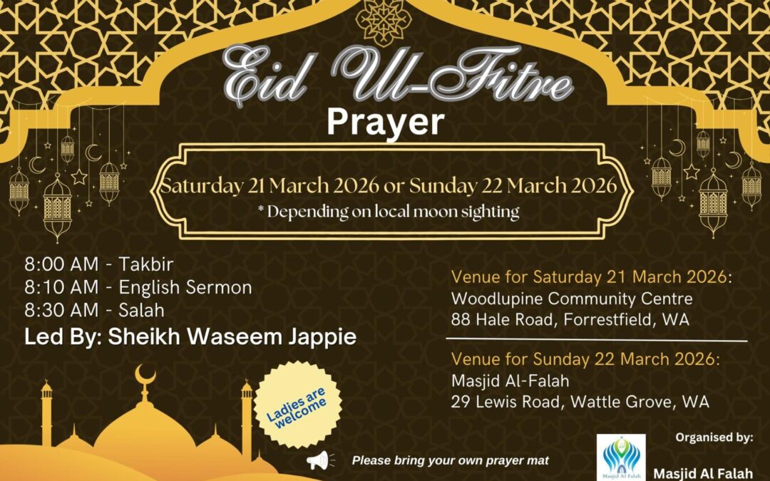 🌙 Eid Ul-Fitr Prayer Invitation 🌙 With gratitude and joy, we warmly invite you and your family to join us in celebrating the blessed occasion of Eid Ul-Fitr with congregational prayer. 📅 Date: Saturday, 21 March 2026 or Sunday, 22 March 2026 (Subject to local moon sighting) 🕗 Program
