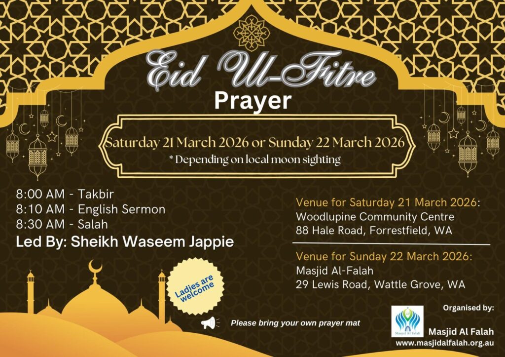 Masjid Al-Falah hosts monthly talk, including a Q&A session, delivered by esteemed scholars to provide spiritual guidance and share beneficial knowledge with Muslims across the Perth Metropolitan region. All members of the community (including Muslims, non-Muslims, and people of different faiths) are welcome to attend the talk and get benefited. These gatherings address a variety of significant and timely topics, such as reflections on current world affairs, teachings from the Qur’an and the life of beloved Prophet Muhammad (ﷺ), and Islamic manners and etiquettes.